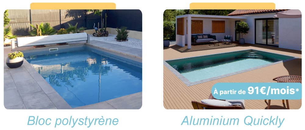 Piscine aluminium Quickly à partir de 91,07€ par mois, avec un apport de 3500€, pour une dimension 5×2 m – hauteur 1.30m avec margelles travertin, filtration classique, escalier d’angle (hors terrassement, livraison et pose). Hors assurance facultative. 5,35% taux de crédit pour une acquisition totale de 12 000€ sur une durée de 120 mois.