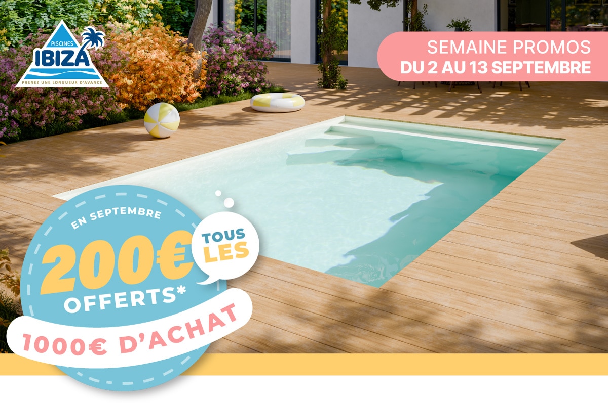 Du 2 au 13 septembre, offrez-vous votre piscine pour cet été, et profitez de 200€ offerts tous les 1000€ d’achat* sur nos modèles aluminium et bloc polystyrène.